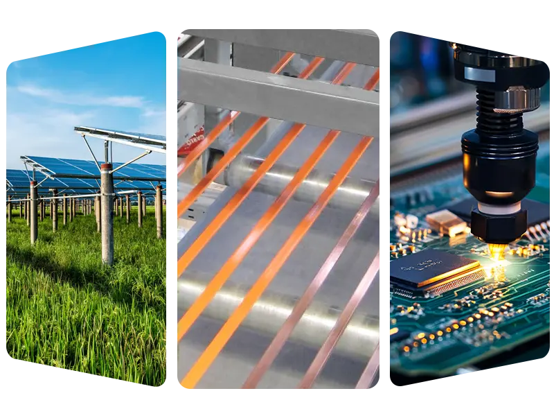 • ஒளிமின்னழுத்த புலம்: ஃபோட்டோவோல்டாயிக் வெல்டிங் ரிப்பன்கள் மற்றும் பஸ்பார்களின் வெகுஜன உற்பத்தி, கூறுகள் மின்சாரத்தை திறமையாக நடத்த உதவுகிறது.